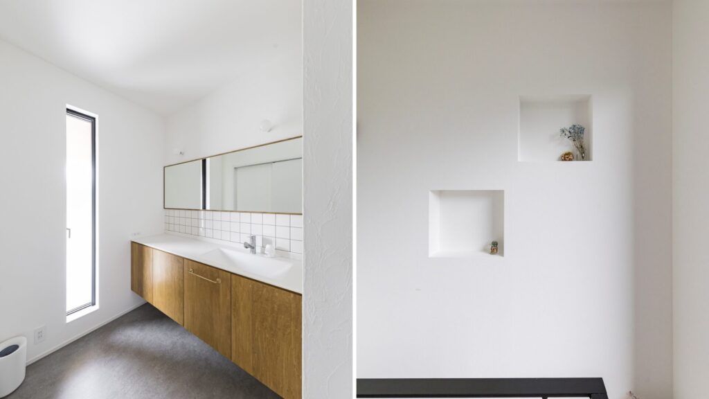 自由設計のお家づくりでオリジナルの空間を感じて頂ける【洗面】と【ニッチ】を造作でご提供することにこだわりました。モニターハウスオーナー様にも、造作で自由度の高い洗面や壁のアクセントになるニッチ収納を自分好みにアレンジして頂けます。