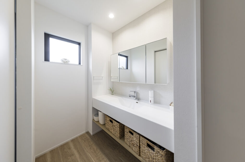 忙しい朝に混み合わない大人2人並んでも余裕のある広さの洗面台